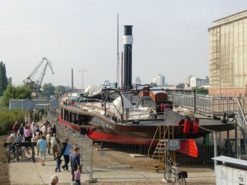 Saniert wurde der Kettenraddampfer "Gustav Zeuner", der im Norden des ehemnaliogen Handelshafen als Museum "vor Anker" liegt
