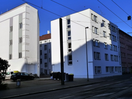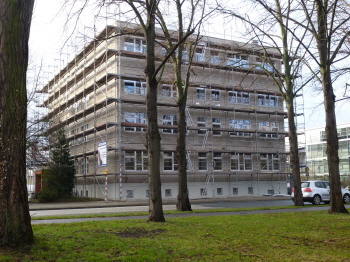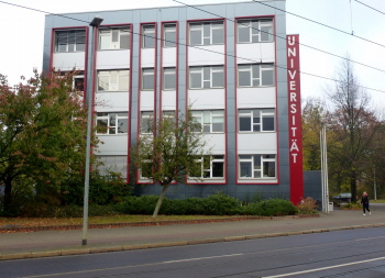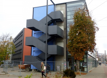 Am Gebäude der Wirtschaftswissenschaft (Pfälzer Straße/Gustav-Adolf-Straße) wurde bis Anfang November 2018 die Sicherheitstreppe angebracht (links) und am Würfelbau, ebenfalls Universitätsgebäude, ist zur gleichen Zeit die Sanierung beendet worden. Fotos H.Mittank, 2018