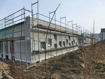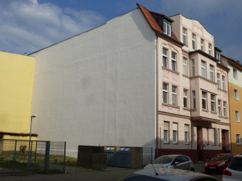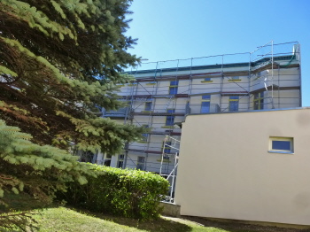 Die Außendämmung am Haus Schifferstraße 12 ist vorn beendet, an der Hinterfront (Foto rechts) sind noch einige Restarbeiten erforderlich. Fotos 30.6.2018