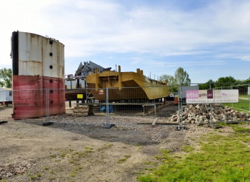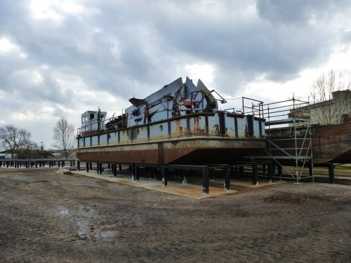 Der Schaufelradbagger wurde kürzlich aus dem Hafenbecken auf seinen Standort im Schiffsmuseum gehoben. Die Sanierung wird 1 bis 2 Jahre in Anspruch nehmen. Foto H.Mittank 18.2.2018
