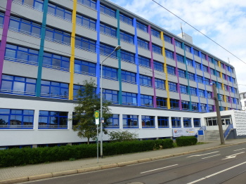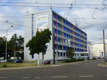 Das ehemalige Gebäude des VEB Autobahnbau-Kombinat Magdeburg in der Agnetenstraße. Ab der Wende befanden sich darin Büroräume. Ab Anfang des Jahres 2018 komplette Sanierung, am 9. August 2018 eröffnet das Stiftungsgymnasium der ev. Jugendhilfe Bernburg. Foto v. 5.8.18
