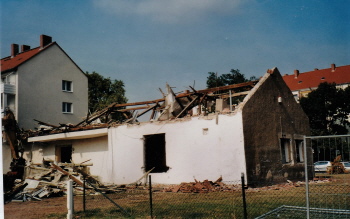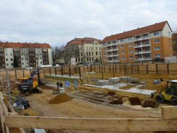 Abriss Jugendklub "Karl Sasse" (l.) und Grundsteinlegung für drei neue Stadtvillen der WBG Stadtfeld eG an der Peter-Paul-Straße (Foto21.2.2019)