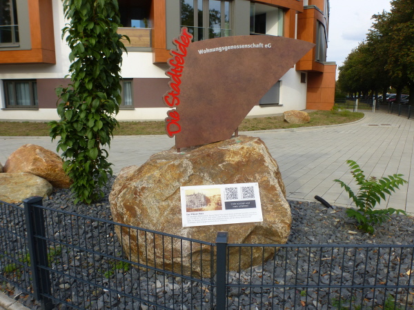 An diesem Findling kann die Geschichte rund um den Pfälzer Platz und des Neubaus der WBG Stadtfeld eG am Pfälzer Platz gesehen werden. Foto H.Mittank
