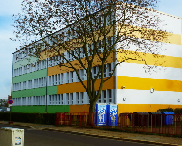 Die Grundsschule/Hort Kiki Sonne in der Moldenstraße 13 erhielt einen neuen farbigen Anstrich. Foto H.Mittank 26.03.2024