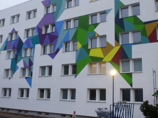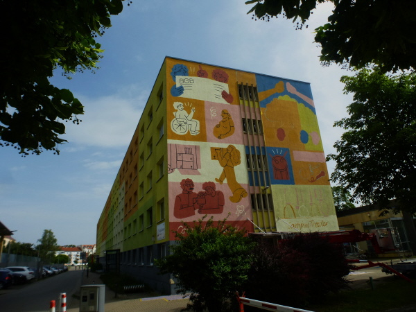 Der Giebel vom Haus 7 der OvGU wurde durch die Künstlerin Vikunia mit einer großen Fassadenmalerei verschönert. Foto H. Mittank /21. Juni 2024
